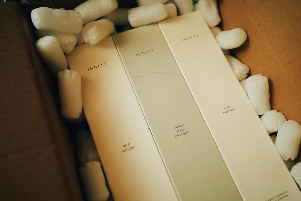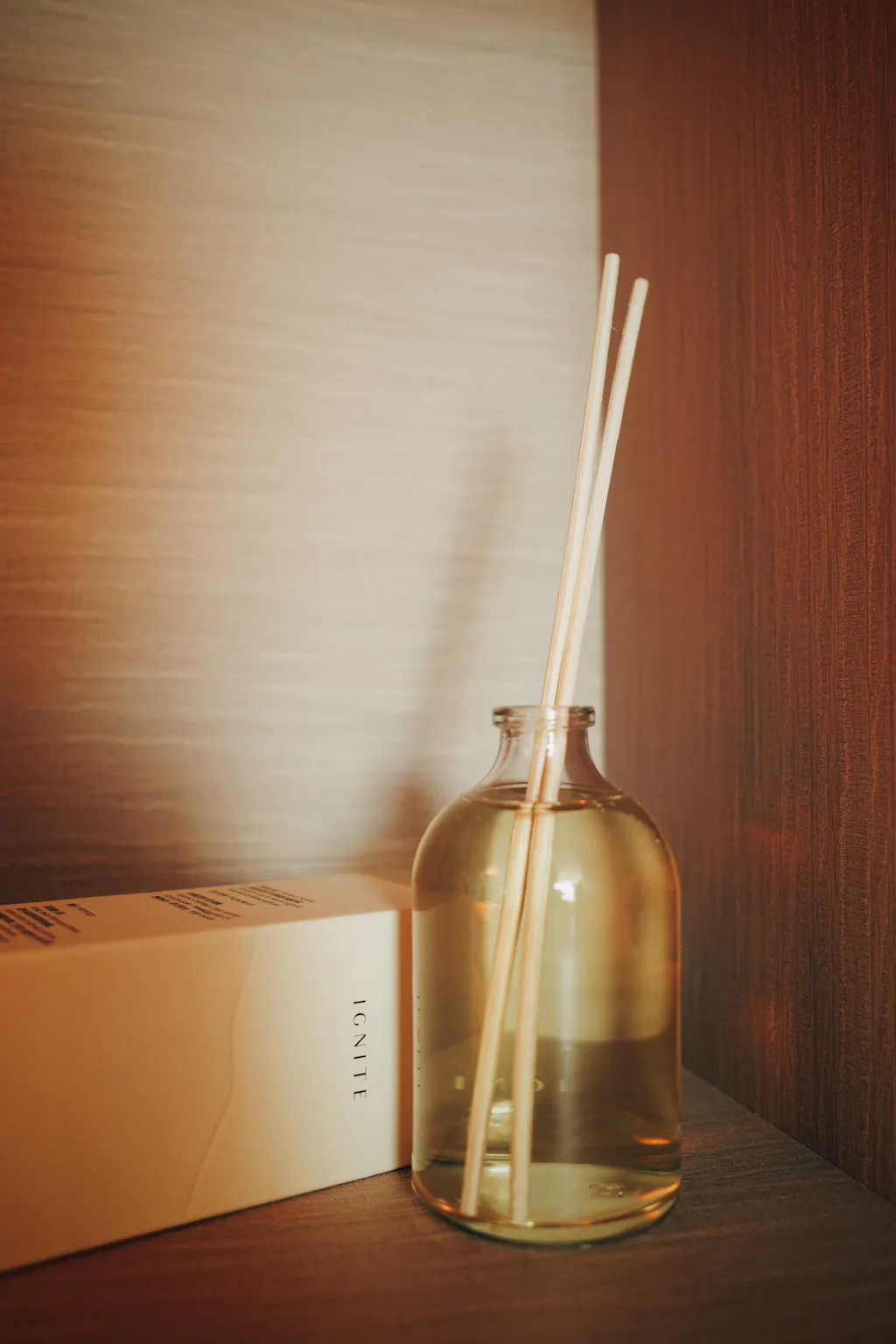 Insert the provided reeds into the diffuser bottle to absorb the essential oil. Reeds need about 24 hours to fully absorb the aroma.
